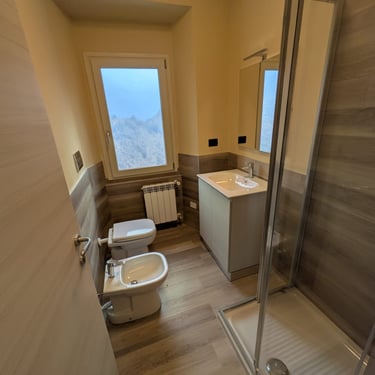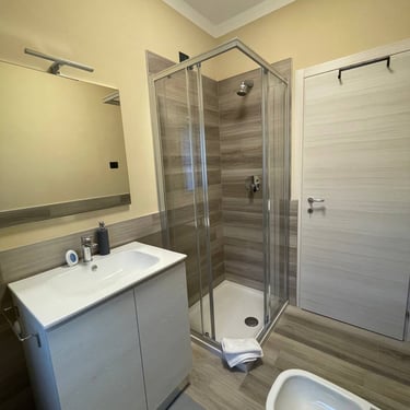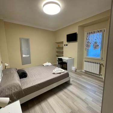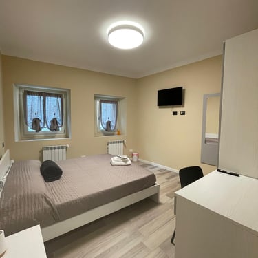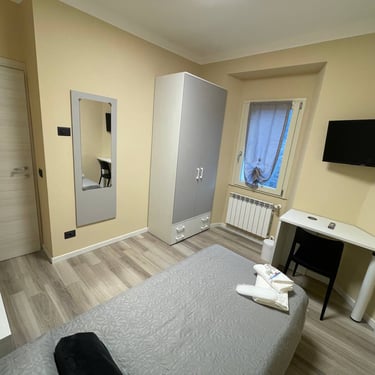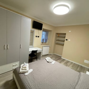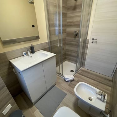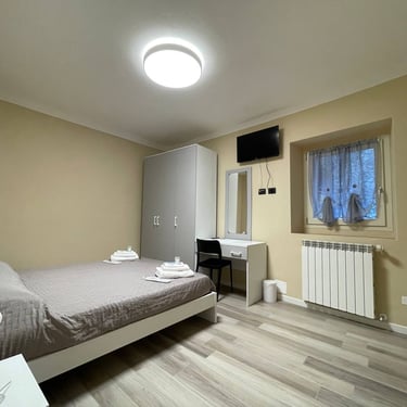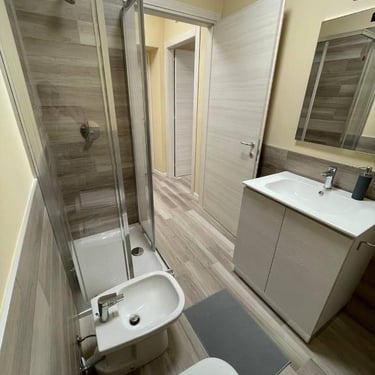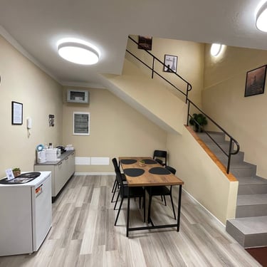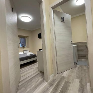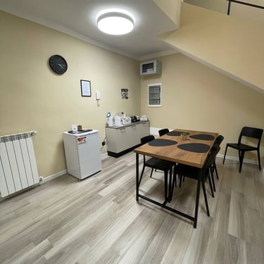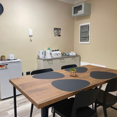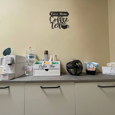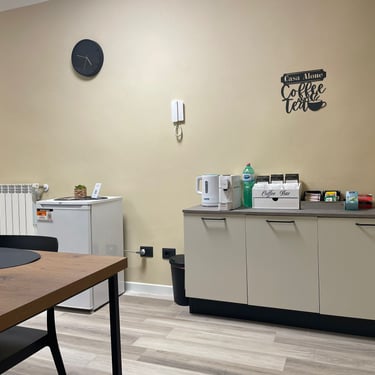 Zona comune con macchina caffè e bollitore per tè e tisane, frigorifero con acqua sempre a disposizione